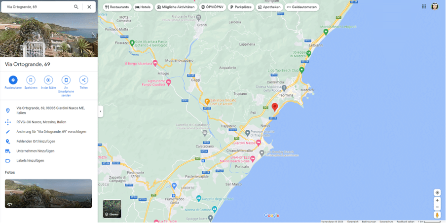 Der Bahnhof Taormina–Giardini ist in etwa 15 Minuten erreichbar, der nächstgelegene Strand nur rund 10 Gehminuten entfernt. Ein kostenloser Parkplatz befindet sich direkt an der Straße vor dem Eingang des Hauses.